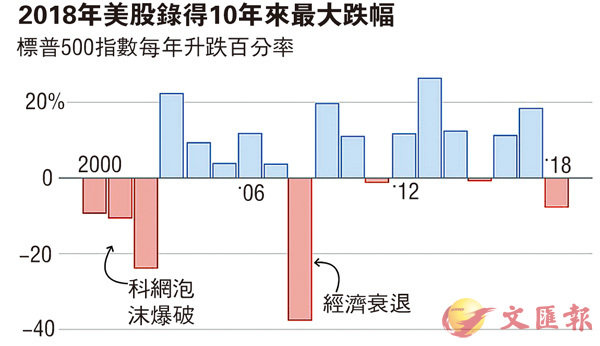美股在過去一年風高浪急,道瓊斯工業平均指數在年初相繼升穿25,000點及26,000點高位,但踏入第四季,受中美貿易戰等負面因素困擾,大市大幅向下,雖然在2018年最後一個交易日報升,但道指全年計仍跌5.6%,標準普爾500指數更累跌6.2%,納斯達克指數則跌3.9%,三大指數均創出自2008年環球金融海嘯後最差表現。