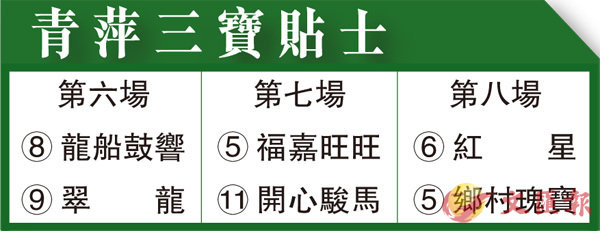 第六場、國際三級賽、一八○○米。「龍船鼓響」今季五戰,於前仗田草千四取得頭馬,上場鬖P一路程後上與「以奇用兵」串Q;今次加至一零三分改爭窄場千八,賽前由小潘出跳走勢依然悅目,加上騎練剛在周日憑「旌暉」炮制大冷W,冷門不妨一敲。