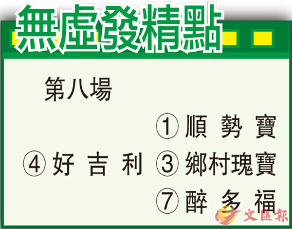 今晚跑馬地馬場將上演八場草地賽事,使用A跑道,今日是季內第五次使用此跑道,上次使用為一月九日,當日度地儀指數為2.70,場地狀況為好地。當日八場賽事有三場頭馬是排五檔,有三場的頭馬是排十一檔,其餘兩場兩匹頭馬分別排一檔和八檔,可見當日的A跑道內外俱宜,並沒有特別有利內檔。跑法方面,八匹頭馬只有「勁勇威龍」、「運才」及「福威勝」三匹是後追,其餘五匹頭馬均是採取跟前或放頭跑法,可見當日的A欄跟前一些來跑較為有利。總括來說,上次的A跑道檔位影響並不大,但比較有利跟前馬匹。今季A跑道成績最好的練馬師為徐雨石,贏了五場頭馬,之後是方嘉柏、呂健威、賀賢及蔡約翰各贏三場。騎師方面,以史卓豐成績最好,贏了六場頭馬,之後是何澤堯與潘頓,各贏了四場。今次睇好大摩馬房「好吉利」,歷來兩戰谷草A欄皆贏馬,易廄後尚未交代,戰意鮮明。