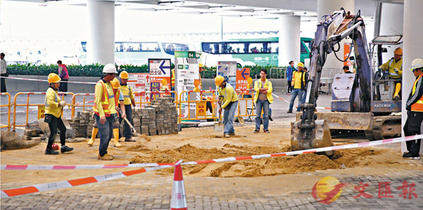 港珠澳大橋香港口岸發生爆裂事故。昨凌晨1時許,入境大堂對開地底一條水管懷疑發生爆裂,大量食水混雜泥沙不斷從地面湧出,令路面猶如變成澤國,由於凌晨時分人流較疏落,未有造成嚴重影響。其間水務署人員趕至關閉水掣及水退後,現場出現面積約3米乘3米的路陷,人員需要用鐵欄圍封受影響範圍進行急緊維修;地底水管爆裂原因有待進一步調查確定。 ■香港文匯報記者 蕭景源、劉友光