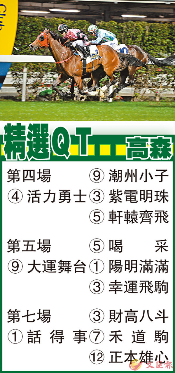 第五場、第四班、一二○○米。「大運舞台」(圖前駒)近賽練馬師安排縮程跑短途,效果卻出奇地好,六戰谷草千二得兩冠一亞三季全上名佳績,今戰料可穩入三甲。「陽明滿滿」剛役競逐谷中一千米,即使排十二檔劣位依然跑入一席接近的第六名,狀態正勇無疑;今次出爭上名率不俗的千二米,可穩佔一席。