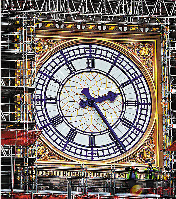 英國倫敦著名地標大笨鐘前年起進行修復工程,預計後年完工,其中北面經翻新後外觀日前首次曝光,鐘面回復早年的藍色和金色配搭。負責修復的研究人員表示,希望看到鐘面回復原色後,與倫敦的現代化形成對比。 ■綜合報道