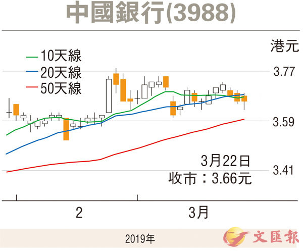 上周五中行平收3.66元(港元,下同),處於10天、20天水平,下位支持為50天線的3.59元,倘今早隨跌市低至3.60元/3.59元,不妨趁低收集。