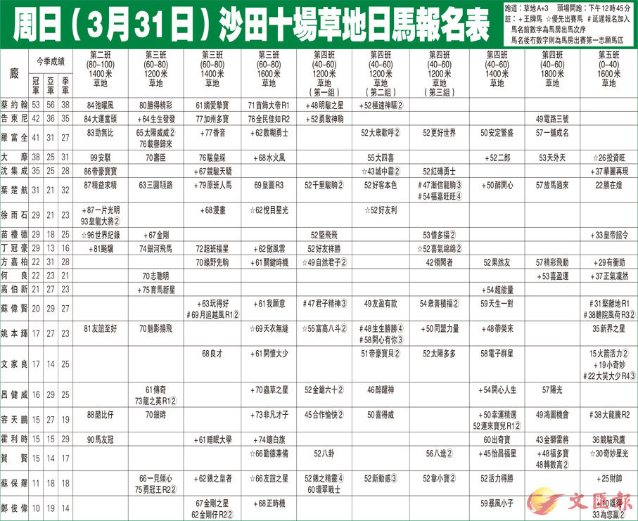 周日(3月31日)沙田十場草地日馬報名表