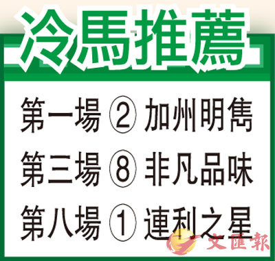 第八場、第三班、一六五○米。蘇保羅馬房的「連利之星」上季七歲贏三場,評分更推高至九十分,表現大器晚成;今季七戰最佳得第四名,但走勢開始有睇頭,反映狀態已經跑起驉A評分亦減過龍;翻查資料,「連利之星」同父馬耐拚,如「特務飛龍」及「尊兄」,在港累積多場頭馬,而且六、七歲仍有好表現。「連利之星」在港已贏八場,其中七場在同程取得,分利馬反彈此其時。