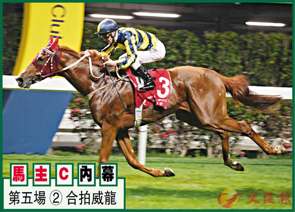 第五場、第三班、二二○○米。「合拍威龍」季內配蘇兆輝魒旬韝@哩贏馬開齋;前仗原班人馬再戰勝途,礙於排在十二檔起步,全程發揮綁手綁腳,最後太遲撻茪O追第四,落敗不可作準;上賽易配潘頓轉戰千八,排五檔以均速戰略再傳捷報;今次轉爭二千二長途,以牠的血統來看定可應付,爭勝機會仍可看俏。