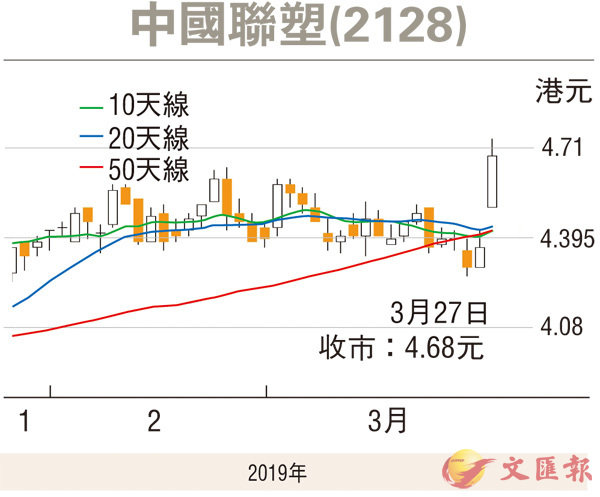 中國聯塑昨天抽升上4.74元(港元,下同),收報4.68元,急升0.32元或7.34%,成交增至1.33億元。