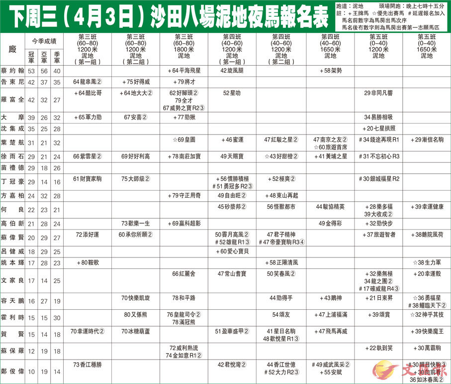 下周三(4月3日)沙田八場泥地夜馬報名表
