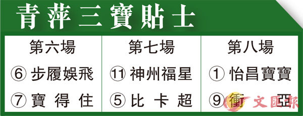 第七場、第三班、一八○○米。「神州福星」來港前鰝k國由著名練馬師費伯華訓練,在當地上陣九次,跑獲兩冠三亞三季;來港後也未見進步之餘亦乏表現,至今十戰從未上名,今次減至六十四分新低縮爭谷草千八,易配冷殺手蔡明紹操刀,臨場如有大冷分頭可扒逆水。