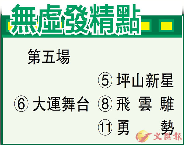 今晚跑馬地八場賽事使用C跑道並向後移欄,今次是季內第八次使用此跑道,上次使用為三月二十日,當日度地儀指數為2.7,場地狀況本來為好地,第二場開始改為好至快地。當日八匹頭馬,既有「禾道駒」及「福愛寶」排一檔、「神州俊馬」排三檔;也有「鑽飾神聖」及「精彩飛動」排九檔、「大運舞台」排十檔,可見當日的C跑道並沒有傾向內檔的馬匹。跑法方面,頭五場冠軍馬清一色是使用後追跑法,尾三場頭馬則是使用跟前或放頭跑法。值得一提是尾三場賽事的步速分布均是傾向均速,後追馬要後來居上十分困難。總括來說,當日的C跑道並沒有傾向跟前跑的馬匹。今季在C跑道贏馬最多的練馬師是姚本輝,贏了六場,之後是丁冠豪贏五場。騎師方面,今季贏馬最多的是潘頓,贏了十二場,之後是田泰安贏了七場。今次推介「大運舞台」,剛勝正在谷草C跑道,老馬逢迴光勇料用得就用。