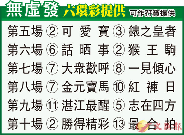 第六場「話晒事」上仗加盟東廄初出千二米跑第三有起色,今次加程跑外地勝途正合,新倉有力省招牌。「猴王駒」早前在從化終於打開勝門,及後返港三戰千二都所負不遠,今次加程難得同場快馬多,此駒待直路馬群拉散,就可施展強橫後勁排眾而出。