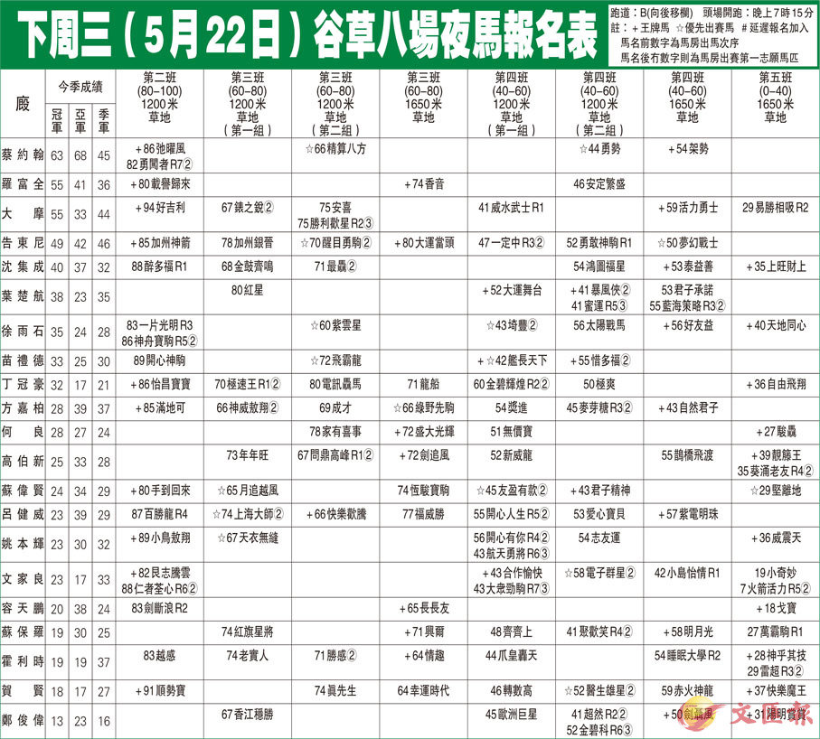 下周三(5月22日)谷草八場夜馬報名表