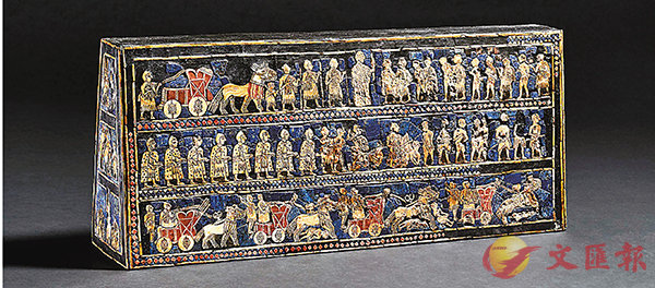 約公元前2500年製造,由貝殼、青金石、紅石灰及瀝青等組成,出土於伊拉克。這件藝術品在有限的空間容納了超過100個人物與動物形象。 香港文化博物館供圖