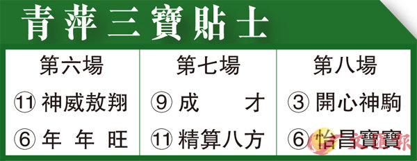 第六場、第三班、一二○○米。「神威敖翔」跑法主動之輩,谷草賽事雖然欠缺賽績支持,惟上仗出爭田草千四鶶笆驕陳膉U搶放搏殺有心,帶到拉士百餘米曾一度佔先,可惜終點前被「喜佳龍」及「健快聯盟」等駒追越只跑第四;今次交予豐仔縮爭谷草千二,排外檔定有錢分,不妨以冷門敲之。