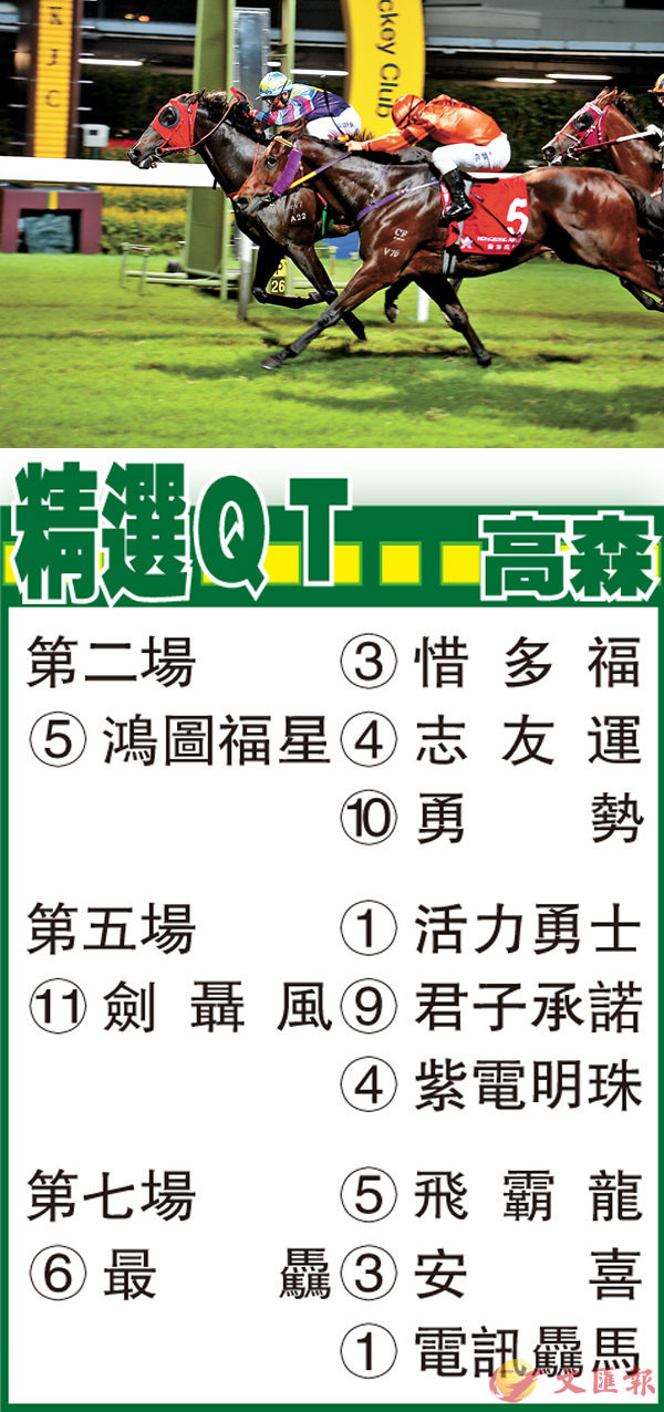 第五場、第四班、一六五○米。「劍聶風」剛役角逐窄場一哩,十檔起步未能楔得好位,沿途無遮擋下走三疊跟在前列,仍能保持佳速得第四;今戰取位如順風順水,定可提升名次。「君子承諾」最近三場先在五班賽同程反彈,上次更能輕取「活力勇士」添食;復課快試所見勇況依然,再捷可期。