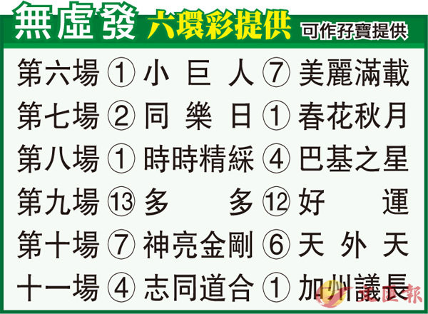 第八場「時時精綵」今屆國際賽香港瓶盟主,歷來配潘頓十次獲六冠兩亞一季,人馬合作上名率達九成實屬天仙配,交出水準料對手難攖其鋒。「巴基之星」今季加盟蘇保羅馬房脾氣有改善,上次出爭二千米女皇盃走勢已經復甦八九,今次遮打盃出番十成功力,真係衛冕都唔出奇。