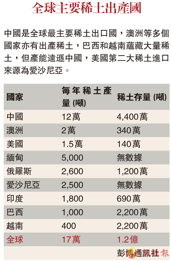 中國是全球最主要稀土出口國,澳洲等多個國家亦有出產稀土,巴西和越南蘊藏大量稀土,但產能遠遜中國,美國第二大稀土進口來源為愛沙尼亞。