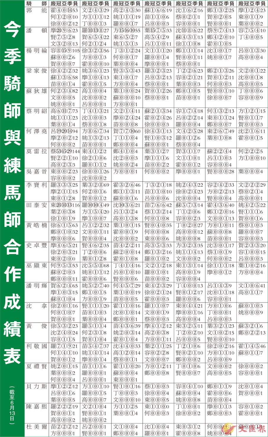 今季至今騎師與練馬師合作成績表