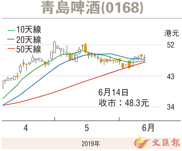 若續看好啤酒股,青島啤酒(0168)是另一較可取的選擇。青啤昨曾高見49.15元,最後以48.3元報收,倒跌0.35元或0.72%,但因屬周內連續第四個交易日企於10天、20天及50天等重要平均線之上,反映其強勢股本色仍得以保持。