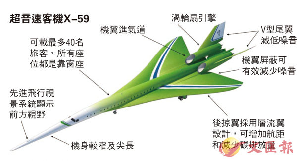 對上一代超音速客機「和諧式客機」,在速度超出1馬赫時,便會產生巨大噪音,故無法在陸地上空以超音速飛行,大大限制其商業應用,最終在2003年退役。洛馬去年獲得美國太空總署(NASA)總值2.47億美元(約19億港元)的合約,負責研發新一代「靜音版」超音速客機X-59,產生的噪音對地面上的人而言,只是「較關上車門的聲音大一點」。