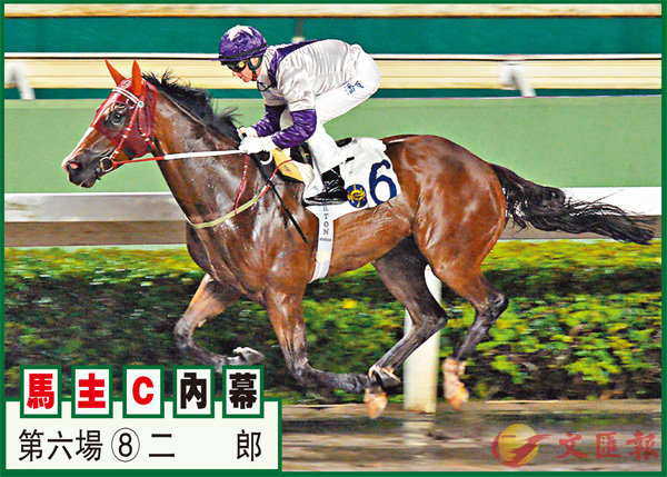 第六場、第三班、一六五○米(泥地)。「二郎」三歲仔大前仗轉跑泥地一哩,鶺蒪C地以一放到底姿態順利勝出;前次回跑田草千四,一檔起步潘頓一早守在馬群前列,入彎順勢踩油走甩再贏兩馬位;上賽回師泥地一哩,馬兒閘前綁c搞到成口血跡,最後仍跑入亞席,今仗續爭同程必全力爭功。