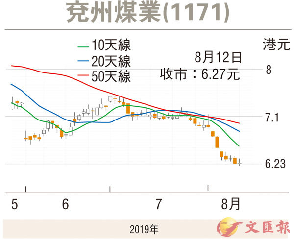同屬煤炭股的兗州煤業(1171)昨曾跌穿1個月低位支持的6.25元,低見6.22元,惟股價尋底後,吸引低吸買盤建倉,尾市曾走高至6.35元,最後則以6.27元報收,升2仙或0.32%,因短期的調整有逐步回穩跡象,不妨考慮作為中線低吸對象。兗煤日前公佈,於2019年第二季度,商品煤產量為2,380萬噸,同比下跌1.69%。商品煤銷量為2,800萬噸,同比下跌0.36%。當中自產煤為2,284萬噸,同比下跌6.09%。於2019年上半年,商品煤產量為4,699萬噸,同比下跌3.11%。商品煤銷量為5,444萬噸,同比下跌1.91%。當中自產煤為4,487萬噸,同比下跌5.66%。此外,於2019年上半年,甲醇產量為85萬噸,同比上升6.25%,甲醇銷量為83萬噸,同比上升5.06%。