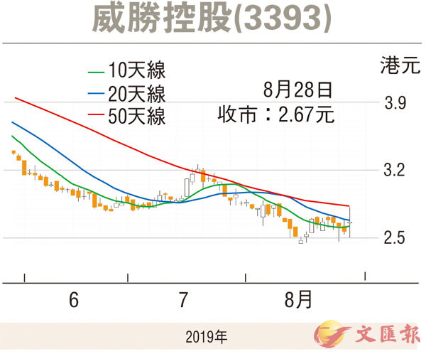 威勝在過去一個月受大跌市影響,由3元跌至2.45元(港元,下同)的52周新低後喘定,昨天受中期業績理想帶動回升,曾高見2.82元,收報2.67元,升0.1元或3.9%,成交791萬元。今次業績意外派中期息6仙,代表管理層對業務復甦十足信心,若末期息仍按上年度派0.20元,則息率將高達9.7厘。現價往績市盈率(PE)8.93倍,估值吸引,可考慮順勢跟進,上望3.2元,跌穿2.45元止蝕。