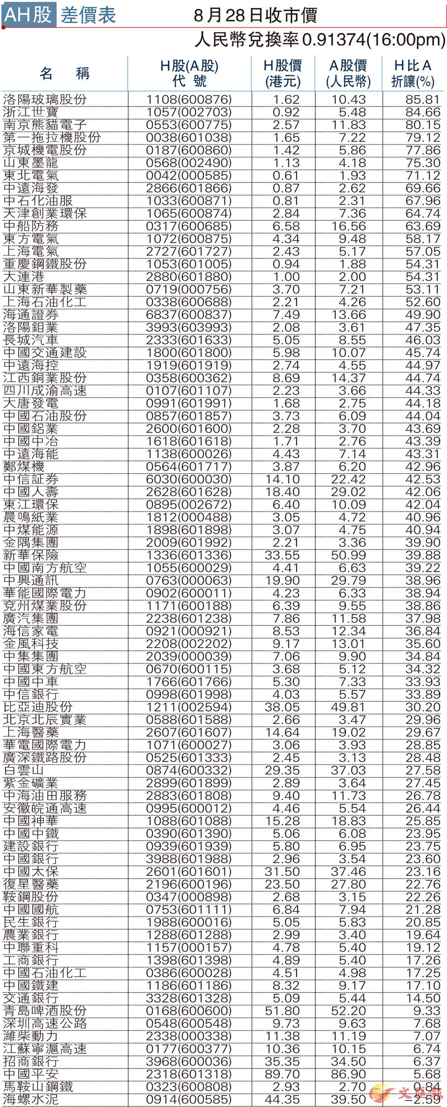 AH股差價表