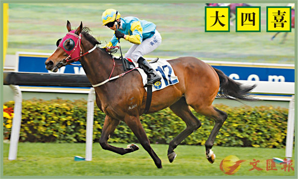 第四場、第四班、一二○○米。「大四喜」上季十二戰錄得一贏三位,全屬田草千二米,其中贏馬一役是擊倒「宜春之星」及「多多」兩匹四班中游分子;八月初復課後操練循序漸進,埋門試直路閘以輕鬆姿態緊貼三班馬「知道必勝」跑第二,狀態已處於水準,今次對手平平未見突出,必把握良機爭取頭馬。