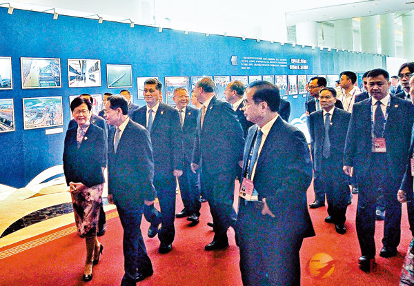 昨日,香港特別行政區行政長官林鄭月娥(左一)在廣西壯族自治區主席陳武(左二)陪同下參觀「9+2」泛珠區域合作成果展示。 ■文/圖:香港文匯報記者 曾萍
