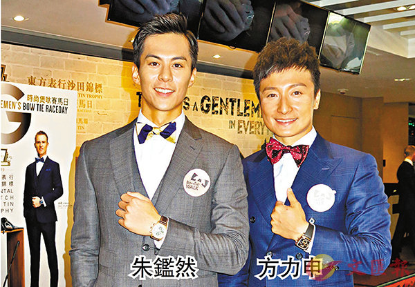 香港文匯報訊(記者 李慶全)方力申(小方)與朱鑑然(朱仔)昨日穿西裝打煲呔出席賽馬活動,小方笑言向來少穿西裝故自覺眼前一亮,來到時更勞煩女職員來幫他打煲呔,首次有女生這樣細心,令他分外窩心。他笑說:「女生識打呔未必會加分,間中這樣就當是情趣,我也可以為她打蝴蝶結。」