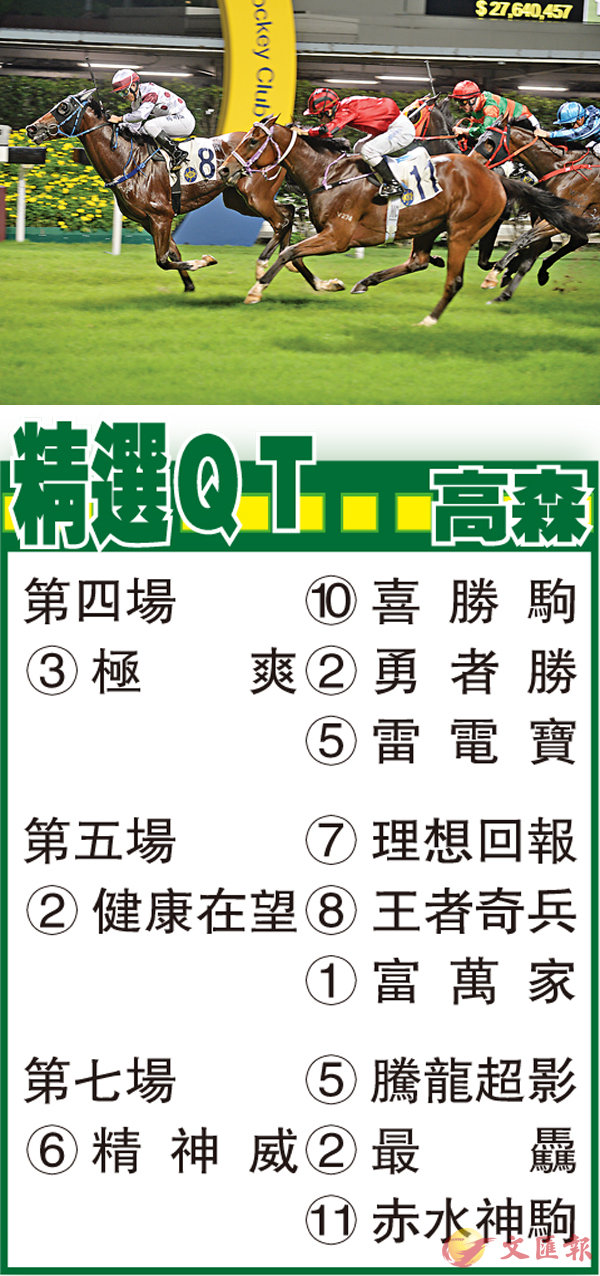 今日跑馬地馬場將會上演八場草地賽事,使用C跑道向後移欄競逐,跑道內欄向中央移入八米,闊廿二點五米,直路長三百三十四米,比A跑道長廿二米,今次是季內第一次使用此跑道,上次使用是七月三日,當日草地度地儀指數為2.72,場地掛牌為好地。翻查當日八場賽事,除了「金飯碗」、「無價寶」及「活力飛彈」是排內檔起步之外,餘下的五匹頭馬均是排外檔,可見當日的C跑道並沒有傾向內檔馬。至於跑法方面,八匹頭馬後追的有三匹,跟前或放頭的有五匹,由此可見當日的跑道稍為有利跟前跑的馬匹。上季在谷草C跑道贏馬最多的練馬師是姚本輝,贏了八場。騎師方面,上季谷草C跑道贏馬最多的是潘頓,贏了十九場,之後是田泰安贏了八場。今次推介列陣第七場三班千二米羅富全馬房的「精神威」,上季兩戰谷草千二米全勝包括一捷於谷草C跑道,爭勝機會值得高估。