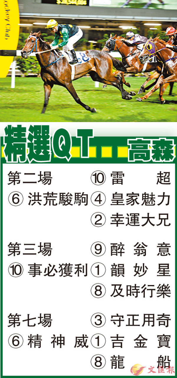 第三場、第四班、一六五○米。「事必獲利」(圖前駒)今季密密跑過三場已錄得兩亞,其中一役僅以頸位之微屈居「綠色勁駒」蹄下;今次用王牌對準強項,對手大幅減弱下,贏面相當樂觀。「韻妙星」上季能夠突破實力攻陷三班賽,而且兩度於谷草中距離入Q;如今評分已落回四班,可重啟勝門。