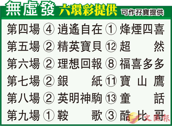 第四場「逍遙自在」在港跑泥地一哩六次得兩冠兩亞一季一第五,演出奇準,上月出戰首爾馬場沙地千八米韓國盃得殿軍,今次返港上陣立即惹來一哥潘頓垂青,料機會值得秤先。「烽煙四喜」歷來五勝泥地一哩途程,今次賽前交由雷神贏好泥地大閘,做足工夫對準首本程必拚。