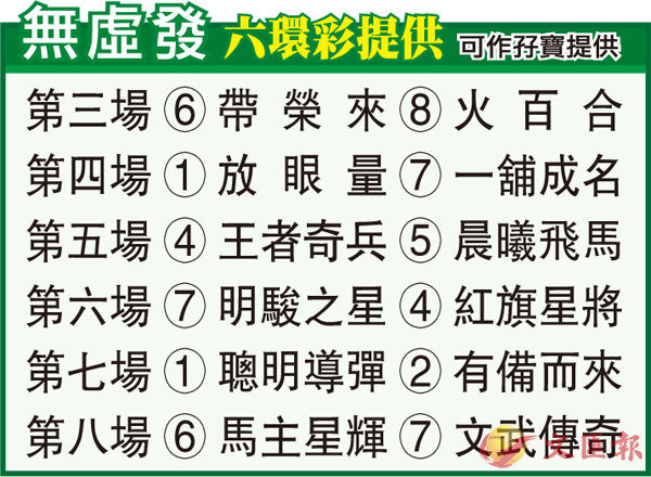 第六場「明駿之星」上場谷草千二米擊敗郭富城愛駒「舞士精神」順利贏馬,賽後評磅員只加六分不算多,沿班再戰勝途大可梅開二度。「紅旗星將」谷草短途至田草中距離賽事俱可應付,今次賽前做足工夫而臨,今場前置馬無多,有力操控步速偷襲,兼顧為宜。