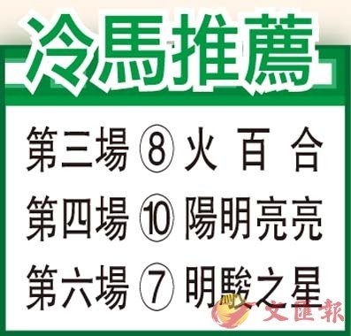 第三場、第四班、一六五○米。「火百合」上季轉戰谷草一哩四戰全上名,負於對手包括「好利運來」、「錶之皇者」及「轉數高」等,全部都是四班超級馬;上次季內初出馬房打王牌再爭同程,賽前試泥閘起步稍慢,惟直路追上走勢毫不覺懶散,以中長途馬來說狀態在水準,果然在陣上即以輕鬆姿態報捷;環顧今組對手既無上述此等超級馬在,而本身跟前跑法夠主動能佔得先機,只要一早咬前守靚位發揮,有望再增添勝仗。