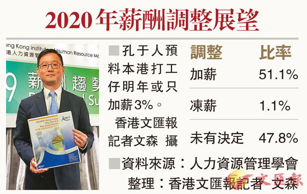 學會預測,打工仔明年仍然可以獲平均加薪3%。孔于人指,有51.1%的受訪企業表示,已經決定來年會向員工加薪,而表示凍薪的則只得1.1%,其餘的47.8%公司就暫時未有決定。