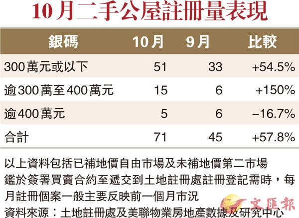 香港文匯報訊 本港社會亂局未止,二手公屋則大放異彩。據美聯物業房地產數據及研究中心綜合土地註冊處資料顯示,10月份二手公屋(包括已補地價的自由市場及未補地價的第二市場)註冊量錄71宗,較9月份45宗上升57.8%;金額錄約1.91億元,按月亦升約57%,雙雙創4個月新高。
