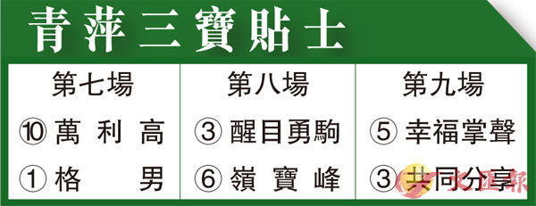第九場、第二班、一六五○米。「幸福掌聲」上仗回配雷神出爭此程,獲排黃金一檔,出閘後立刻領放在前,以由頭帶到尾姿態輕勝「合拍威龍」三個身位,實力深不可測,今次成哥沿用莫雷拉執韁續爭此程,只要騎者憑馬本身前速夠快克服排外檔不利因素,殺入三甲可做得到。