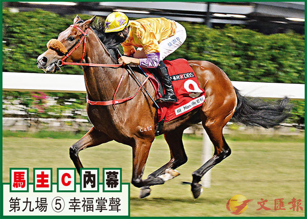 第九場、第二班、一六五○米。「幸福掌聲」初仗田草千四留後跑,未段交出良好追勢跑得接近;前仗轉爭谷草一哩,賽前操練稍為放緩,鞍上人換上對馬兒不熟悉的田泰安,結果出閘後不久便三疊望空,鬗互q再發力上前,卻在最後乏力未能埋尾;上仗回配雷神再爭此程,這次排一檔快閘單騎領放一氣呵成贏三馬位,今次加九分再爭此程,料可坐位望贏。