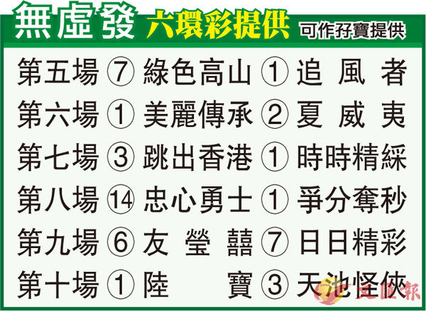 第五場「綠色高山」在澳洲昆士蘭兩戰一冠一季,被評七十分插三班起步,血統與陣上表現琣X,潛力不俗,谷草熱身後即轉返田草來意不善。「追風者」今季一連兩仗跑入三甲,相信今場在快步速形勢下更利後上跑法,有本錢在此打開勝利大門。
