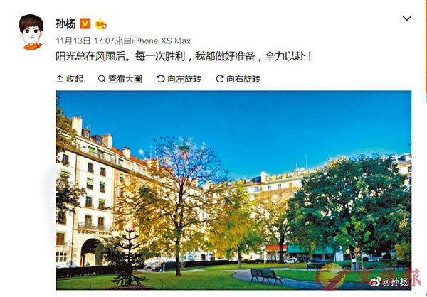 香港文匯報訊(記者 陳曉莉)備受矚目的關於孫楊「興奮劑檢測」案件的聽證會將於香港時間15日在瑞士舉行。已抵達瑞士的孫楊13日在自己的社交媒體上晒出了一張當地的圖片(圖),並配文:「陽光總在風雨後。每一次勝利,我都做好準備,全力以赴! 」