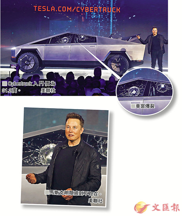 美國電動車生產商Tesla前日在加州的設計中心,發佈首款全電動小型貨車Cybertruck,售價介乎3.99萬至6.99萬美元(約31.2萬至54.7萬港元)。然而發佈會出現尷尬一幕,工作人員用鋼珠擲向號稱非常安全的防撞玻璃車窗時,車窗竟應聲爆裂,在台上的行政總裁馬斯克明顯感到不自在,最終匆匆完成發佈會。