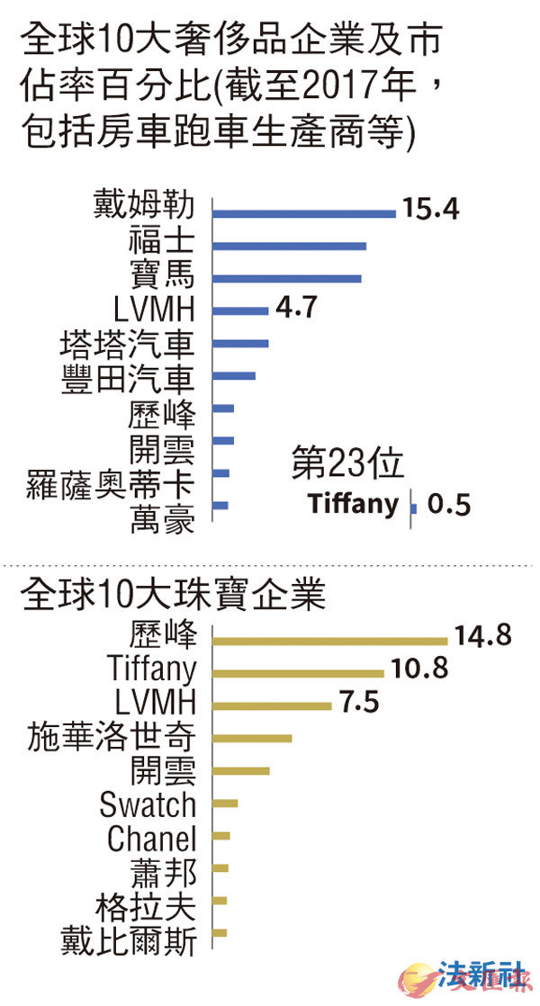 LVMH旗下擁有達75個奢侈品牌,如Christian Dior等,珠寶品牌則包括寶格麗(Bulgari)、Chaumet等。有182年歷史的Tiffany近年跌出頂尖品牌之列,公司為轉型推出更多低價產品,希望轉攻年輕人市場,但卻面對Pandora等對手的激烈競爭,同時還要應付強美元的影響。分析認為,Tiffany最終願意接受每股135美元的收購價,固然與全現金方式收購具吸引力有關,但同時也可能反映管理層對業務前景不太樂觀,希望藉交易發展新方向。■綜合報道