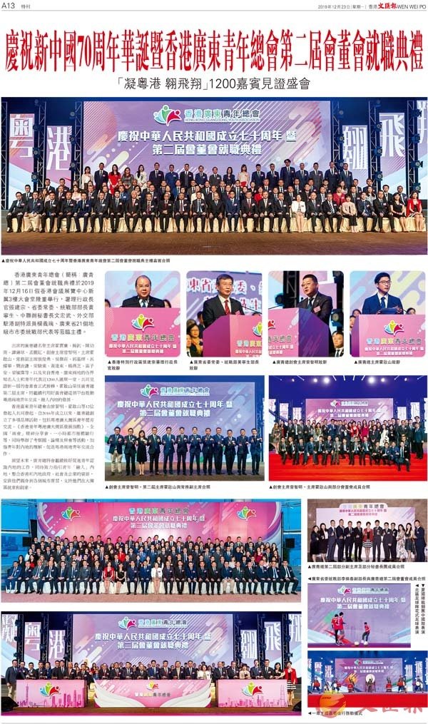 香港廣東青年總會(簡稱:廣青總)第二屆會董會就職典禮於2019年12月16日假香港會議展覽中心新翼3樓大會堂隆重舉行,署理行政長官張建宗、省委常委、統戰部部長黃寧生、中聯辦秘書長文宏武、外交部駐港副特派員楊義瑞、廣東省21個地級市市委統戰部代表等蒞臨主禮。