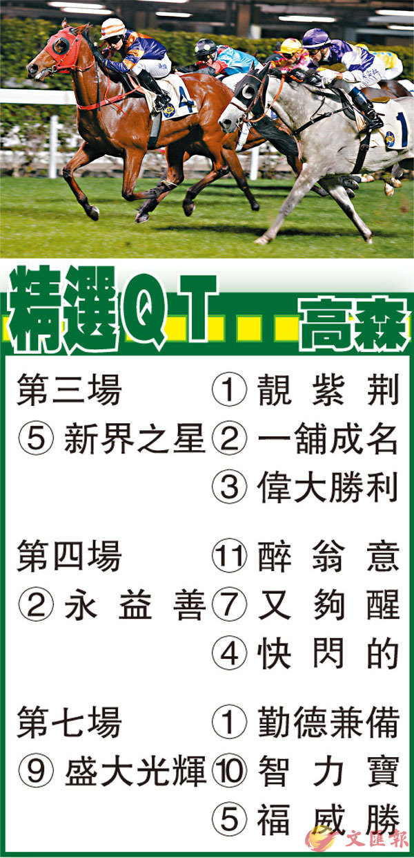 第三場、第四班、一六五○米。「新界之星」剛仗於谷草一哩擊倒「鑽飾神聖」及「永益善」後,備戰未見放緩,狀態持續勇銳,看動態決心爭取連捷,值得繼續跟進。「一舖成名」季內兩贏四班谷賽一哩,憑本身中置跑法,在今組甚少放頭馬場合應佔點優勢,如取位順利有權再勝。