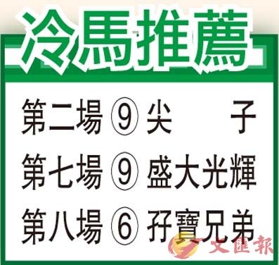 第七場、第三班、一六五○米。「盛大光輝」從賽績上看,此駒無疑以谷中一哩最首本,歷來所獲的一冠兩亞全在同程取得,因此季內先後四次出爭沙田,根本敗不作準;其實前仗泥地千二路程嫌短還要抽十一檔,早段包尾之下,單單一條直路追回第七只負四位多,表現已相當不俗;上次加程返谷草一哩抽到莫雅執韁,放到最後一步才被趕過得第二;今次繼續攻谷中一哩,比上季入Q時更低兩分,爭勝條件可以話相當充分。