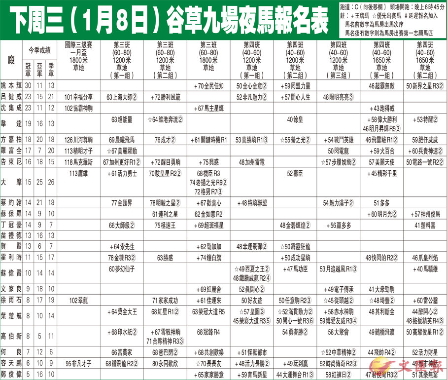 下周三(1月8日)谷草九場夜馬報名表