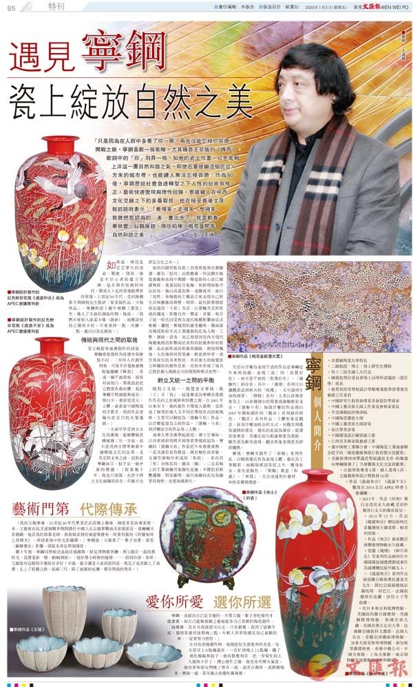 「只是因為在人群中多看了你一眼,再也沒能忘掉你容顏......」閒暇之餘,寧鋼喜歡一展歌喉,尤其鍾意王菲版的《傳奇》。歌詞中的「你」別具一格,如他的瓷上作畫,紅色底釉上洋溢一團自然和諧之氣,即便在景德鎮這個匠從八方來的城市裡,也能讓人無法忘掉容顏。作為60後,寧鋼歷經社會急速轉型之下人性的扭曲與修正,藝術快速變現與理性回歸,景德鎮人在中西文化交融之下的多番取捨。他在接受香港文匯報訪談時表示:「看得多,走得多,想得多,我就把我認為的『美』畫出來了。我喜歡春華秋實、仙鶴展翅、風吹稻穗、梅花盛開等自然和諧之美。」■文:王逍
