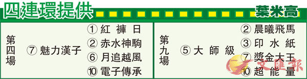 第九場、第三班、一二○○米。「大師級」上季六戰全敗賽績欠吸引,今季踏入四歲即大幅躍進,初出谷中一哩放頭走,步速不慢之下被「轉數高」贏四位多,已預視有進步表現;結果翌仗縮程爭千二配上蘇狄雄,結果力擒「馬友冠」及「明駿之星」爆半冷贏馬,值得一提,「明駿之星」其後再出即補中,賽事水準不弱;贏完再出換上楊明綸,但由於排十一檔關係,因此全程要在三、四疊游走,如此跑線不敗才怪,但值得留意的,則是馬匹抄大外疊轉彎,居然亦猶有餘力追回第四;上場移回二檔,跟前之下直路均速走返跑第四,今次只要在直路上及早望空,相信可以再添勝仗。